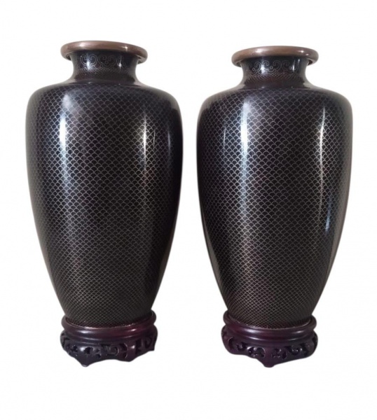 • Par de vasos com decoração em cloisonné e esmalte em formato de escamas de peixe. Base em madeira esculpida, periodo revolução chinesa.