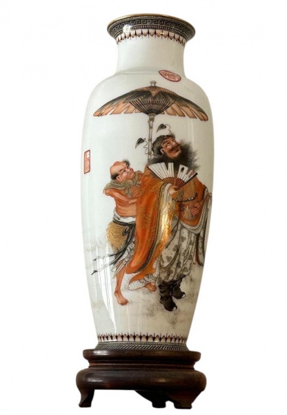 • Vaso em porcelana chinesa, com rica pintura representando Zhong Kui, uma divindade lendária chinesa, capaz de subjugar fantasmas e afastar espíritos malignos. Ele é reverenciado como o Senhor Sagrado da Bênção e Proteção do Lar na cultura tradicional chinesa. Na China antiga, retratos de Zhong Kui eram frequentemente pendurados como proteção contra danos e desastres. O vaso possui também a pintura de ideagramas e um morcego em referência os cinco morcegos correspondem às Cinco Bênçãos do pensamento chinês: amor, prosperidade, conduta virtuosa, boa saúde/atingir uma idade honrosa e morte natural. O vaso é assinado na base e repousa sobre uma base de madeira, China, começo do século XX.
