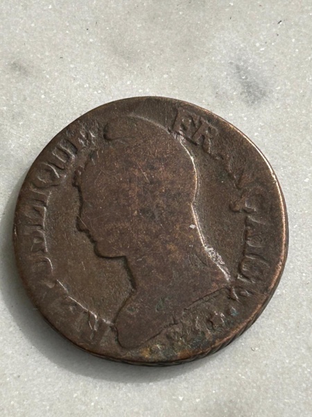 • Rara moeda cunhada na época da revolução francesa em Metz ( AA) de 5 cêntimos Lan 8 ( 22 de setembro de 1799  21 de setembro de 1800) em bronze