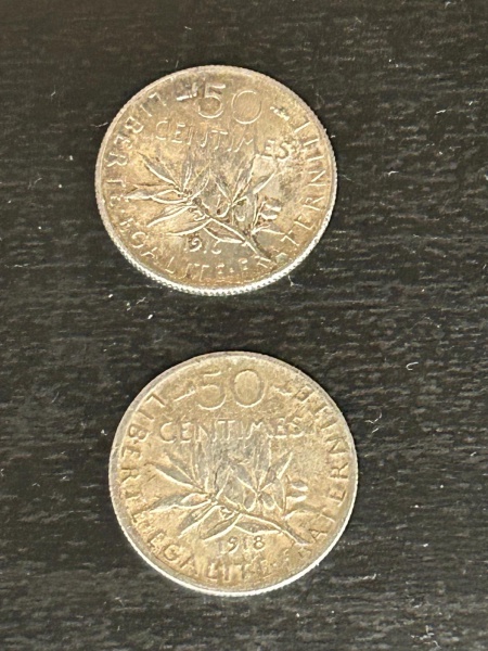 • Duas moedas de prata francesa de 50 centimes de 1916 e 1918 , em excelente estado de conservação, 2,5 gramas cada total 5 gramas