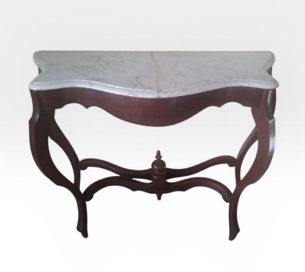 • Console Luís Felipe em madeira nobre com tampo em mármore de Carrara , fratura central necessita restauro, 84x100x42 cm