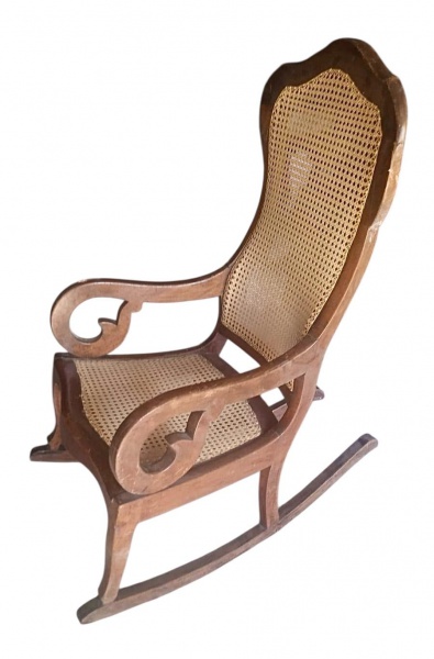 • Cadeira de balanço em madeira nobre com espaldar alta estilo Beranger, Brasil império século XIX, assento em palhinha sintética . Medidas 115x100x62 cm