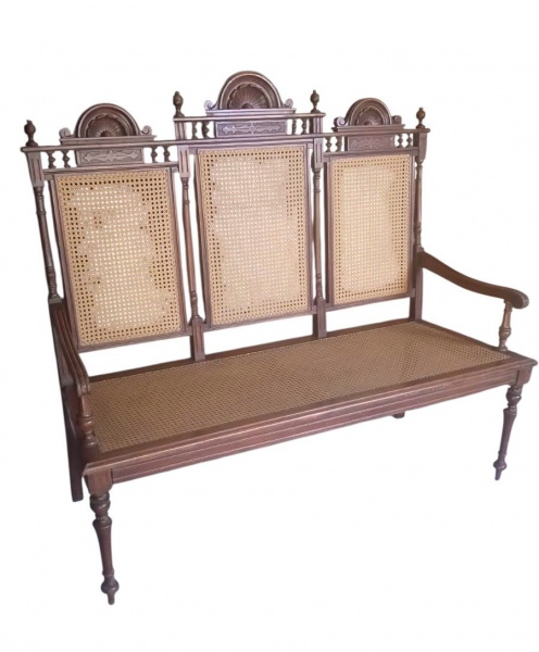 • Namoradeira ou canapé em madeira nobre com ornamentos  de bilros e entalhes em estilo Renascimento alemão, assento e encosto em palhinha sintética , século XIX, 125x140x55 cm