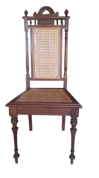 • 6 cadeira  em madeira nobre com ornamentos  de bilros e entalhes em estilo Renascimento alemão, assento e encosto em palhinha natural , pequenos defeitos , século XIX