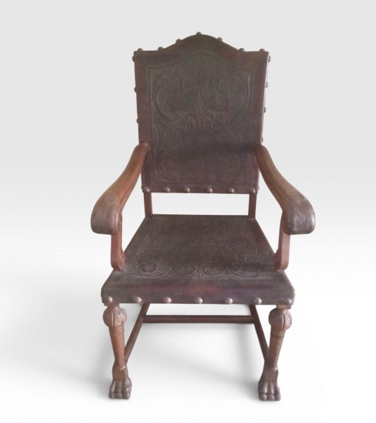 • Cadeirão de braços, dito "manuelino", em madeira nobre, assento e encosto em couro trabalhado com ornamentação em volutas e arabescos, pernas esculturadas, com patas de animal, 100x54x60 cm