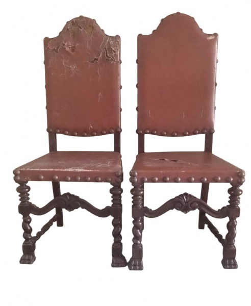 • Par de cadeirões ditos manuelinos, em madeira nobre, pernas esculturadas, com patas de animal, necessitam troca do revestimento., 115x44x60 cm