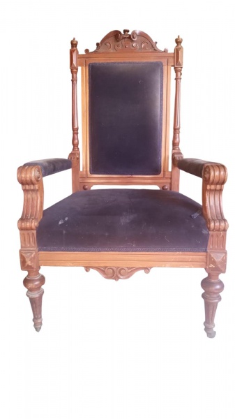 • Sólida poltrona "vitoriana" em madeira nobre entalhada, estofada em veludo azul, 110x70x65 cm