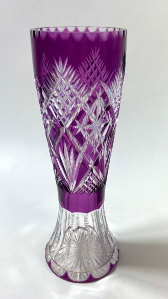 • "BACCARAT, FRANÇA - VASO EM CRISTAL BACCARAT, LAPIDAÇÃO PONTA  DE DIAMANTE, NA COR LILAS. MEDIDAS; 22,5 CM"