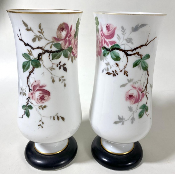 • "OPALINA BACCARAT - FRANÇA SÉC XIX -Belíssimo para de vasos em opalina Baccarat, decoração floral, base preta.  Medidas:  25 cm de altura"