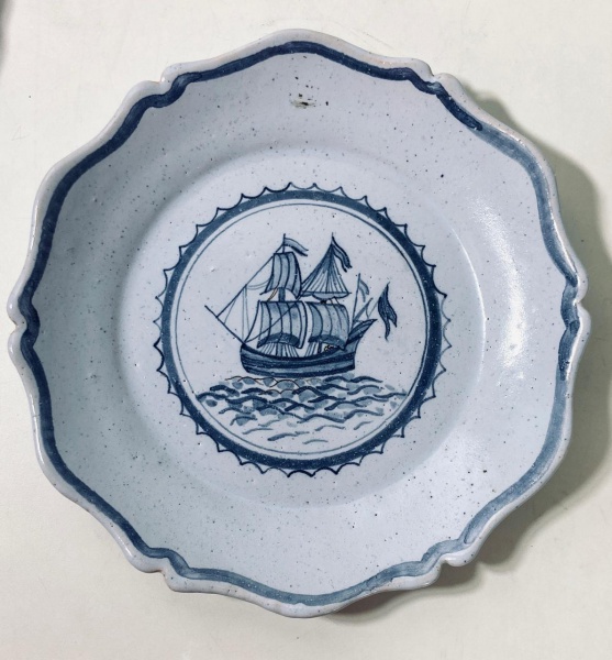 • "PRATO GRES DECORADO COM NAVIO PINTADO Á MÃO. ESMALTADO EM TOM AZUL-CLARO, COM PINTURA CENTRAL REPRESENTANDO NAVIO À VELA SOBRE O MAR, ORLA RECORTADA E DECORAÇÃO ESTILO ARCAICO. VERSO VIDRADO. MEDIDAS: 3 X 24 CM"