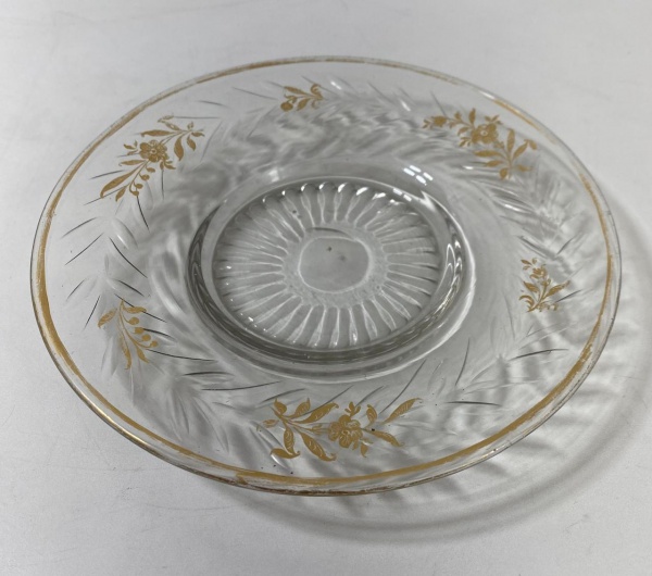 • "BACCARAT - PRATO EM CRISTAL BACCARAT, DECORAÇÃO DOURADA, C. 19251935 -  CRISTAL INCOLOR FINO, DE EXCEPCIONAL TRANSPARÊNCIA, COM DECORAÇÃO EM OURO APLICADO MANUALMENTE REPRESENTANDO RAMOS FLORAIS E FILETE NA BORDA.- GRAVADO À RODA COM PADRÃO GEOMÉTRICO RADIAL NO CENTRO, TRABALHO TÍPICO DAS PEÇAS DE MESA PRODUZIDAS PELA BACCARAT (FRANÇA) ENTRE AS DÉCADAS DE 1920 E 1930. -  O MODELO APRESENTA CARACTERÍSTICAS DOS SERVIÇOS DE MESA DO PERÍODO ART DÉCO, COMBINANDO DELICADEZA E PRECISÃO NA GRAVAÇÃO. PRODUZIDO EM CRISTAL SOPRADO E POLIDO À RODA, COM APLICAÇÃO DE OURO 24 K PELA TÉCNICA DE DÉCOR À LOR FIN. -  DIÂMETRO: 22 CM PERÍODO: C. 19251935REFERÊNCIA: CATÁLOGO BACCARAT 1926 (SERVICE À DESSERT DORÉ), ARCHIVES NATIONALES DE BACCARAT, FRANCE. MEDIDAS: 20 CM"